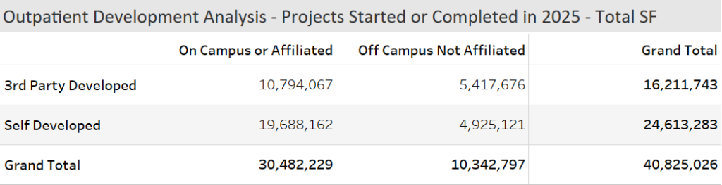 The annual outpatient development report is now available. Produced with collaboration from HREI (Healthcare Real Estate Insights), the 2026 report covers all the outpatient construction projects that broke ground or completed construction in 2025. Over 21 million square feet of outpatient construction broke ground last year, and over 19 million were delivered to market. Third party developers led 40% of the construction in 2025, the other 60% was developed by the health systems themselves.