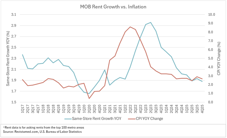 Occupancy is typically consistent, but what is the state of rent inflation within the outpatient sector? Revista’s recently released 4Q25 data shows a year-over-year growth rate of 1.9% (asking rents). The chart below shows what rent growth trend for the past nine years, with inflation (CPI) overlaid. The volatility of rent growth is not as high as CPI, so the scales have been adjusted to better display the relationship. Rent growth generally mirrors inflation, however it lagged the rapid changes that started in 2021.